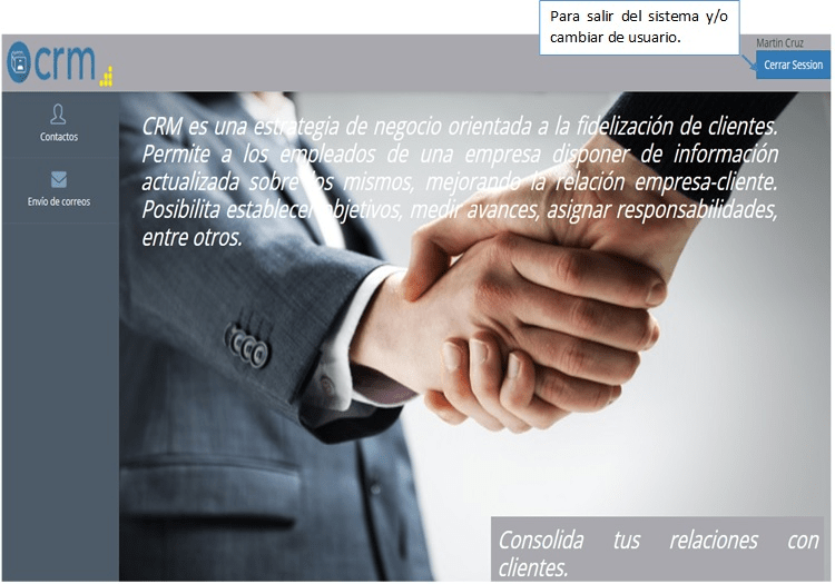 A continuación se visualiza la pantalla principal en la que se explican las características fundamentales del sistema. En ella, a la izquierda, aparecen los módulos que componen el sistema: contactos y envío de correos. En la parte superior derecha está la opción cerrar sesión.
