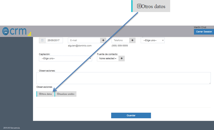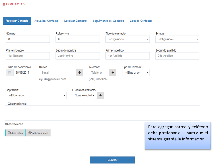 Aquí se ingresa toda la información referente a los contactos. El registro está divido en tres partes: la primera para la captura rápida, la segunda para ingresar más datos y la tercera para ingresar los datos del crédito.