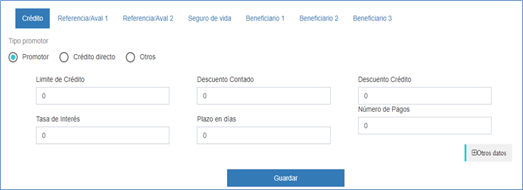 Seleccione el tipo de crédito (promotor, crédito directo u otros), ingrese el límite y, si lo desea, ingrese los descuentos, tasa de interés, plazo en días y número de pagos. Luego presione guardar. Sólo es obligatorio seleccionar el tipo de crédito e ingresar el límite, los demás datos son opcionales.