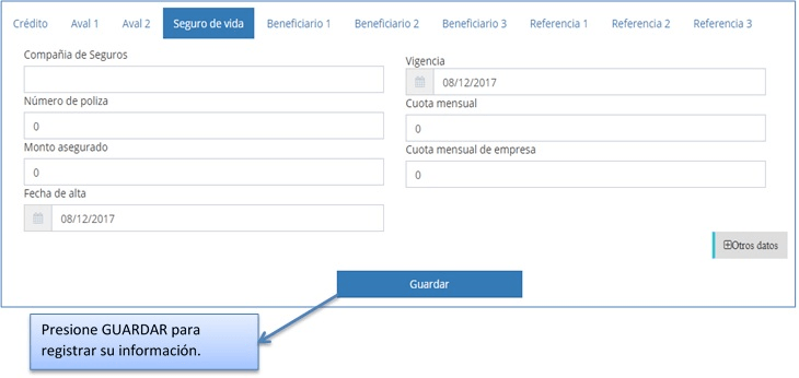 A continuación se muestra la pantalla donde se podrán ingresar los datos del seguro de vida. Esta información no es obligatoria.