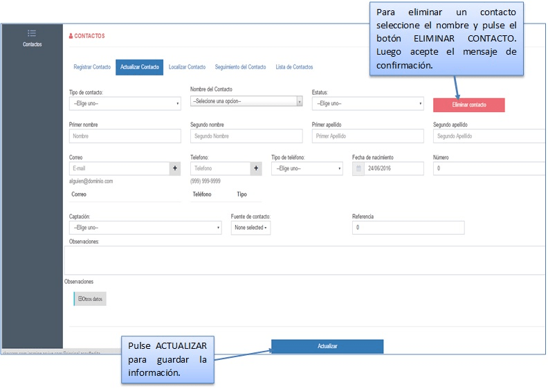 Cuando localice al contacto, aparecerá toda su información, modifique el dato que desee y presione actualizar. Si los datos se actualizaron correctamente, el sistema muestra el siguiente mensaje en la parte inferior derecha de la pantalla: