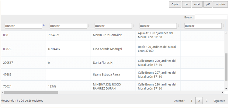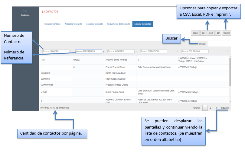 Muestra un listado de los contactos registrados en el sistema. Incluye los siguientes datos: número de contacto, referencia, nombre, dirección y teléfono. También se tiene la opción de búsqueda y se brinda la posibilidad de copiar, imprimir o exportar la información en los formatos Excel, PDF y CSV.