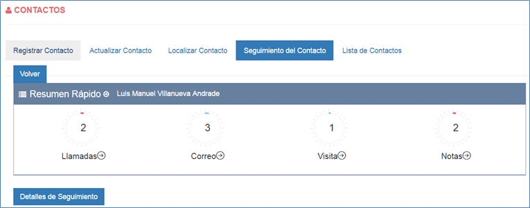 Al seleccionar el contacto, se muestra un resumen con la cantidad de llamadas, correos, visitas y notas registradas; si desea registrar nueva información debe ingresar a la opción deseada.