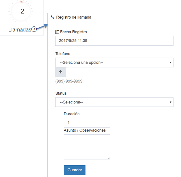 Para registrar una llamada, dé clic en el vínculo llamadas, ingrese los datos de la misma y dé clic en el botón guardar. El estatus de la llamada puede ser: exitosa, no Exitosa y pendiente. La duración es en minutos.