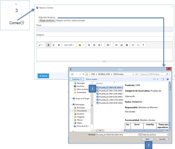 Puede enviar correos al contacto, para ello dé clic en el vínculo correo y le aparecerá la pantalla para este fin; en ella escriba el destinatario, asunto y mensaje. Si desea adjuntar archivos, seleccione elegir archivos, elija el deseado y dé clic en el botón abrir. Finalmente, pulse el botón send (enviar).