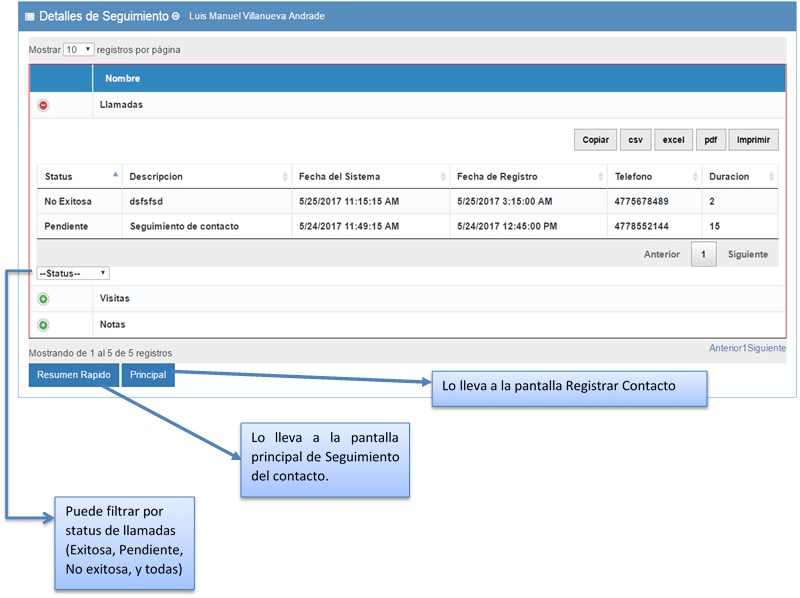 El botón detalle de seguimiento contiene un reporte de las acciones de seguimiento realizadas a un contacto. En cada detalle tendrá las opciones de copiar, exportar (CSV, EXCEL, PDF) e imprimir.
