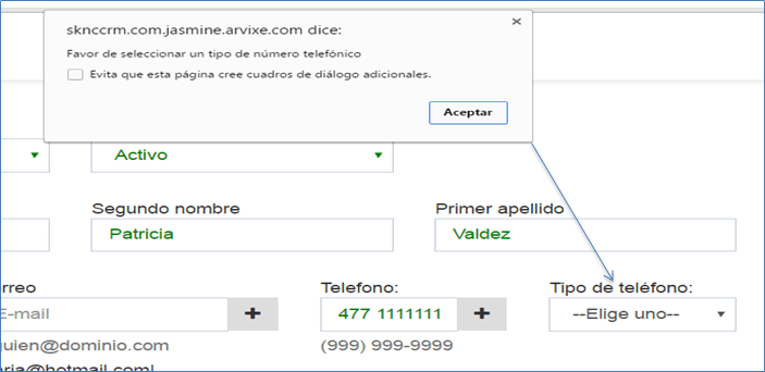 Se debe elegir un tipo de teléfono para que el sistema pueda añadir el número, de lo contrario se mostrará un mensaje pidiendo que elija un tipo de número telefónico:
