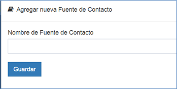 Si la fuente de contacto no existe, se puede agregar una nueva presionando el +. Inmediatamente aparece una pequeña pantalla en la que se debe ingresar la nueva fuente de contacto y presionar el botón guardar.