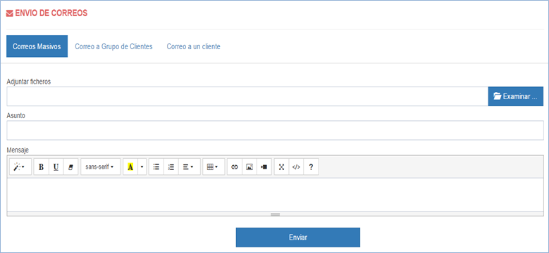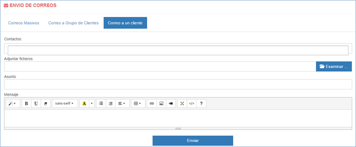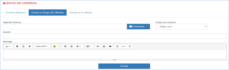 Desde esta opción puede enviar correos a sus contactos de forma masiva (a todos los contactos registrados), por grupos de clientes (esta opción hace envíos a los contactos, prospectos o clientes), y por cliente (a un cliente en específico).